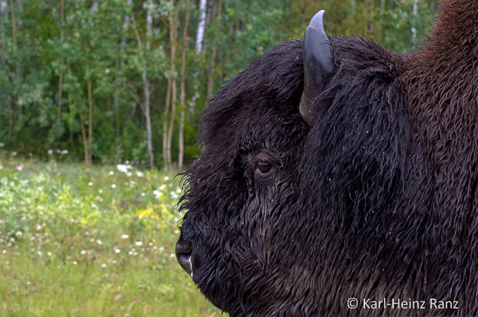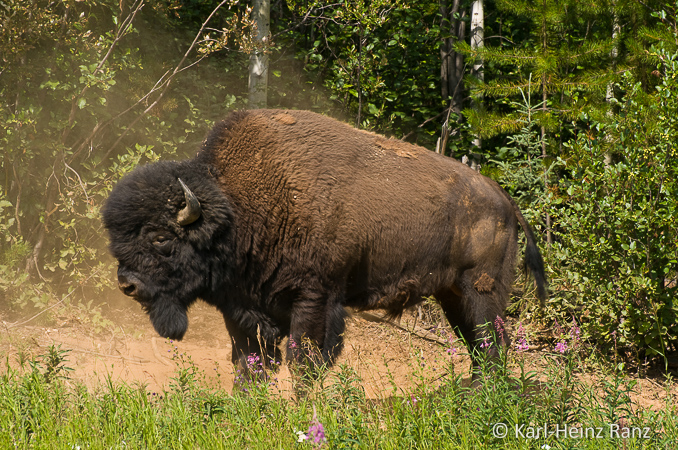 Hier im hohen Norden treffen wir auf eine Unterart des amerikanischen Bisons, den Waldbison. Der Bison ist im Gegensatz zu Rindern temperaturresistent bis ca. minus 40 Grad Celsius (Rinder nur bis ca. minus 15 Grad). Trotz seines hohen Gewichtes erreicht er eine Höchstgeschwindigkeit von 50 km/h.