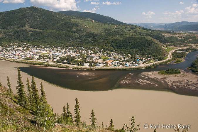 Vom Midnight Dome habe ich einen herrlichen Rundblick über die von Goldschürfern zerpflügte Landschaft bei Dawson City, das am Zusammfluss von Klondike und Yukon River liegt. Auf dem Top of the World Highway geht es auf 105 Kilometer über die Grenze nach Alaska.