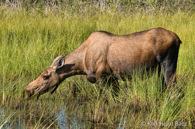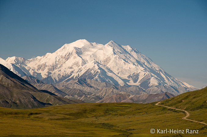 Ein gigantisches Wetter hatte ich dann im Denali-Nationalpark. Ins Parkinnere führt eine etwa 100 km lange Straße bis Kantishna, ich genieße das nur an wenigen Tagen im Jahr wolkenfreie Panorama über der Alaska Range, mit dem krönenden Höhepunkt, dem Mount McKinley (Mount Denali), mit 6.193 Metern.