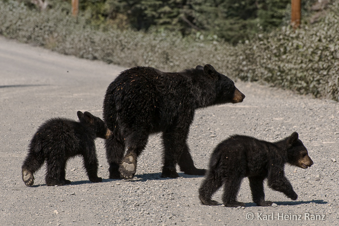 Immer wieder sind in der unendlichen Weite Bären zu sehen. Der Schwarzbär ist in Westkanada sehr verbreitet, er ist deutlich kleiner und leichter als der Grizzly. Wie die meisten Bären sind Schwarzbären Allesfresser. Allerdings machen Pflanzen mehr als 75 Prozent ihrer Nahrung aus.