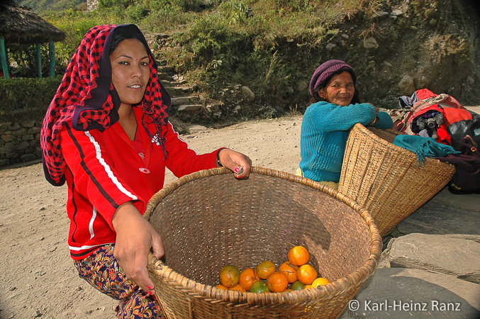 Wir beginnen unser Trekking in Besisahar und folgen dem subtropischen Tal des Marsyandi-Flusses. Reisfelder, Bambus und unzählige Natursteinstufen wechseln einander ab. Am Wegesrand nutzen wir die Gelegenheit und kaufen noch frische Mandarinen und Bananen.