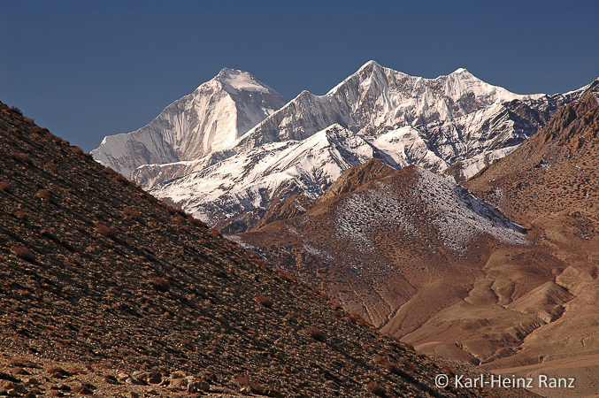 Bei wunderschönem Wetter und -9 Grad erreichen wir den höchsten Punkt mit 5 416 Meter und steigen hinab nach Muktinath zu der von Buddhisten und Hindus vereehrten heiligen Pilgerstätte. Dem windigen Tal des Kali Gandaki folgend passieren wir Dörfer wie Jomson, Marpha, Dana und viele andere mehr. Die karge Landschaft geht wieder in waldreiche, vom Terrassenanbau geprägte Landschaft über. Wir beenden die Trekkingtour in Beni.