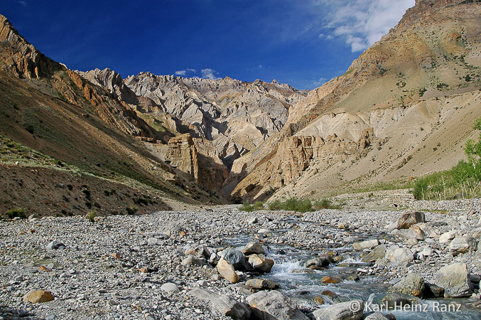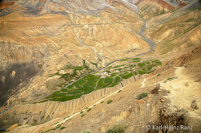 Einmalig diese großartige Hochgebirgslandschaft, breite Talabschnitte wechseln sich mit öden, windgepeitschten Schluchten und staubigen Wegen ab. Dazwischen liegen immer wieder kleine Weiler mit weiß getünchten Häusern und flachen Dächern, am Fuße der kupferfarbenen Berge, wie Zanskar auch genannt wird.