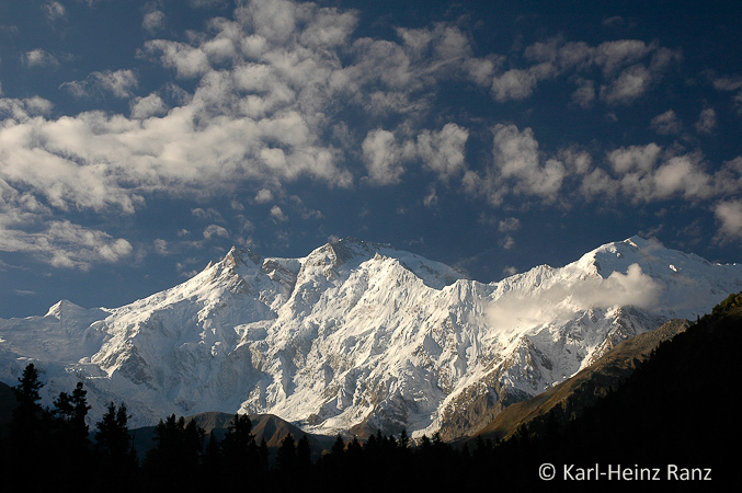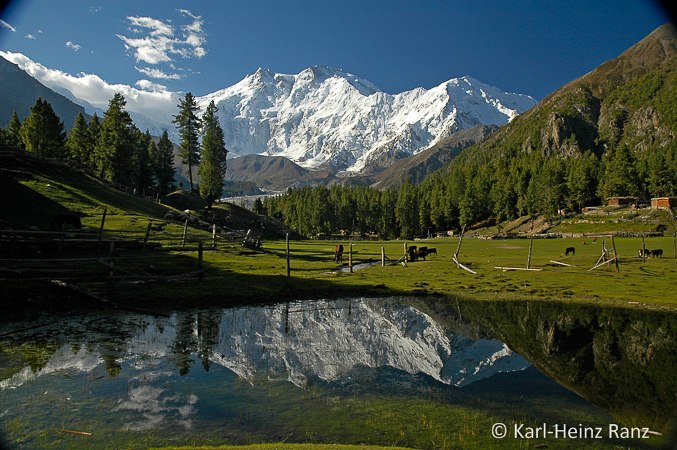Der Nanga Parbat gehört zwar schon zum Himalaya, der Ausgangspunkt Raikot Bridge liegt jedoch direkt am Karakorum Highway. Von der Brücke aus fahren wir mit dem Jeep über einen schwindelerregenden Fahrweg zum Dorf Tato. Von hier geht es dann auf einem ehemaligem Fahrweg in 2-3 Stunden die restlichen 700 Hm bis zur "Märchenwiese" auf 3350 m (kleines Lokal und Blockhütten). In den Morgenstunden ein herrlicher Blick auf den "Schicksalsberg" der Deutschen, den Nanga Parbat.Nach diesem kurzen Abstecher geht es nun mitten hinein ins Karakorum.